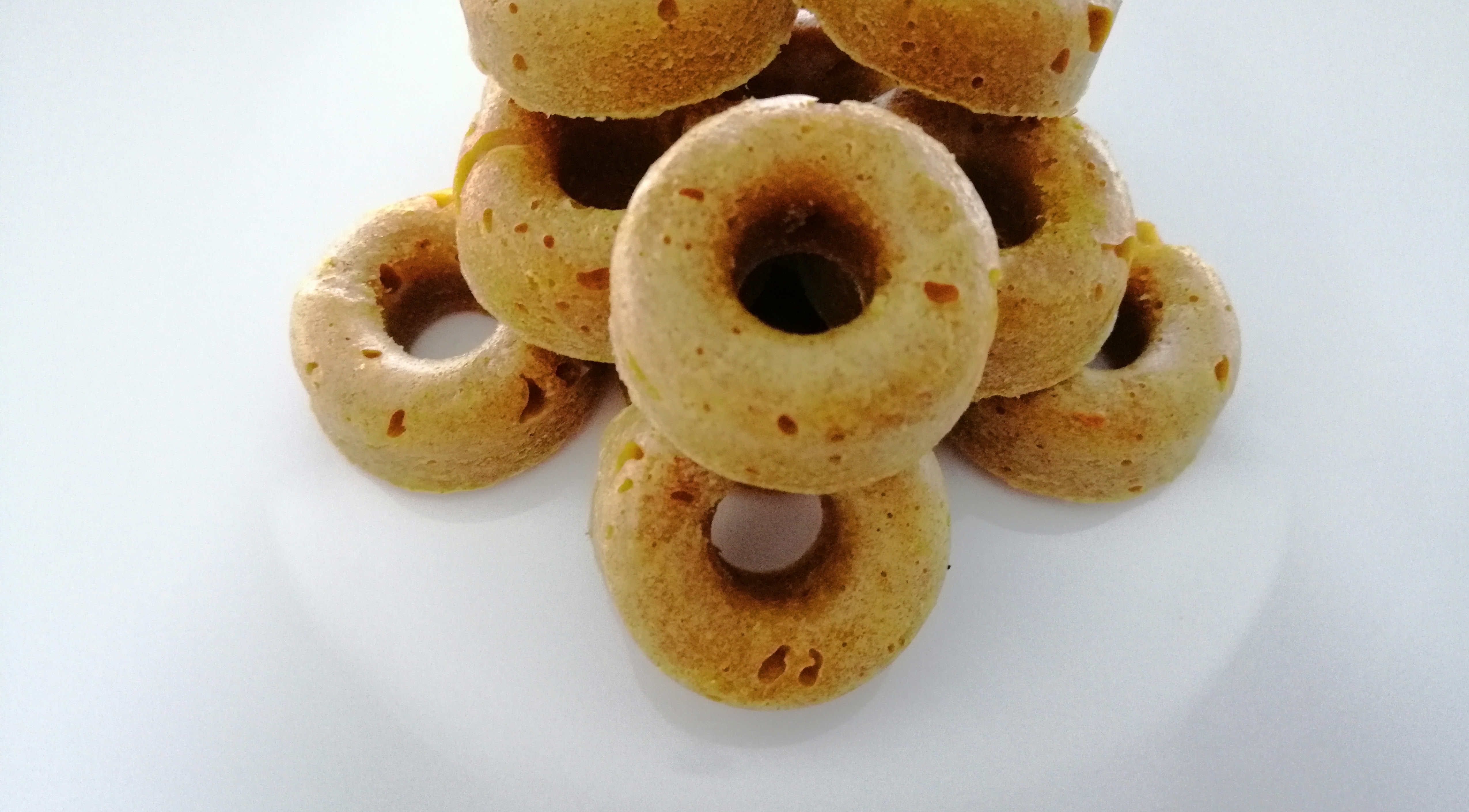 Kook de kipfilet voor 15 min in wat water, laat goed afkoelen en maal deze fijn. Meng de fijngemalen kipfilet met de kaneel en kurkuma. Doe de honing, pompoenpuree (je kunt deze zelf maken, maar ik gebruikte een potje biologische babyvoeding pompoen), pindakaas, ei en het water in een kom en klop dit goed door elkaar. Roer de kip erdoor en voeg als laatste de bloem toe. Meng het met een spatel tot een mooi en vrij stevig beslag. Doe het beslag in een (siliconen) mini-donutvorm en bak de mini donuts gaar in ongeveer 20 minuten. Laat ze goed afkoelen voor je ze uit de vorm haalt. Ik heb de donut in wat magere vanille kwark gedipt en er wat honing overheen gedrizzeld.